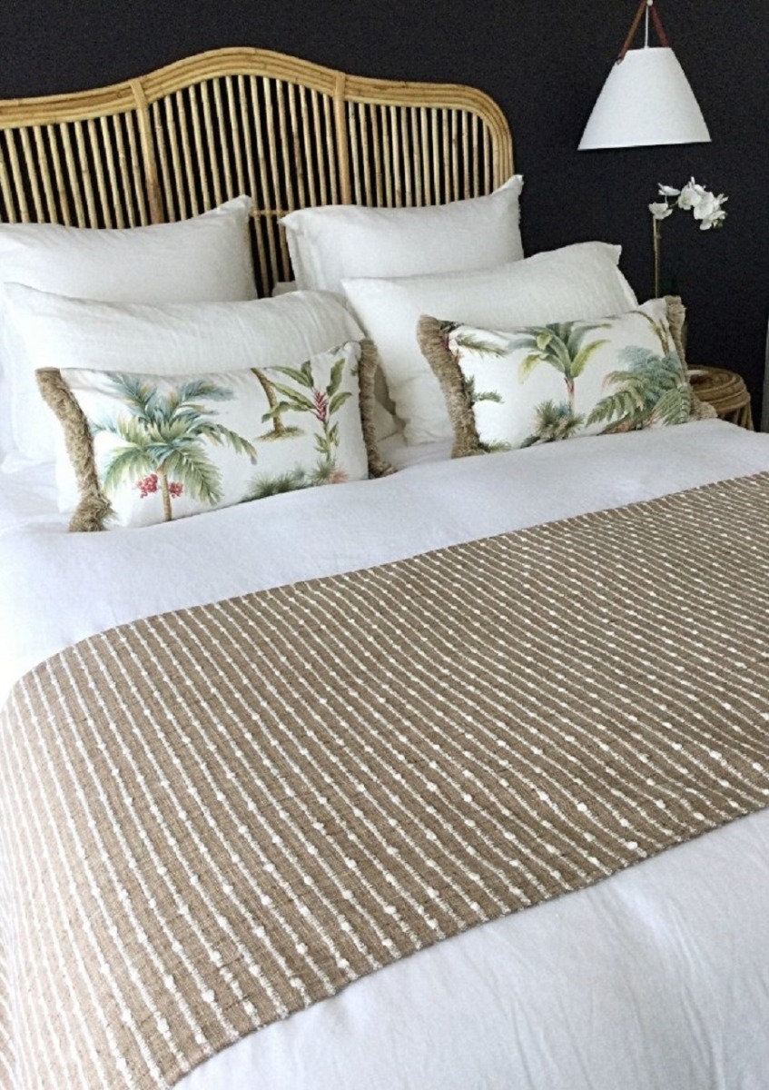 Căn phòng khách sạn phong cách nhiệt đới sẽ thật nổi bật và gây ấn tượng trong mắt khách sạn khi lựa chọn tấm trang trí giường khách sạn từ vải canvas mộc mạc, tone màu nâu kết hợp cùng vỏ gối họa tiết cây dừa tạo nên năng lượng tích cực, thoải mái cho căn phòng