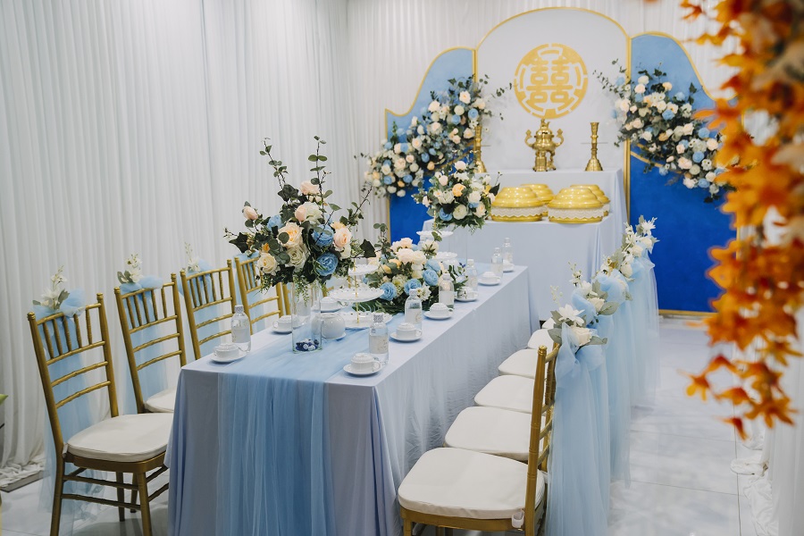 Gam màu xanh blue điểm xuyết xuyết cùng hoa tươi mang đến không gian lãng mạn cho bữa tiệc cưới