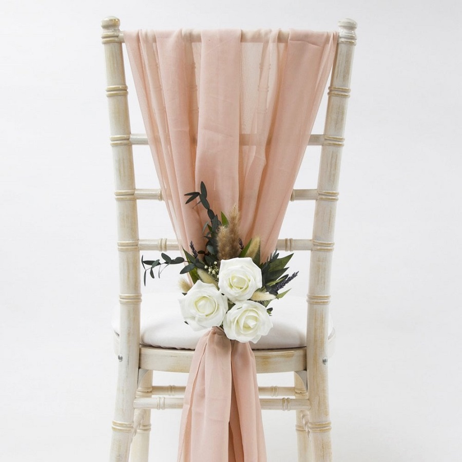 Chất liệu chiffon cũng được ưa chuộng khi làm nơ ghế. Với gam màu hồng cam ngọt ngào, cài thêm hoa tươi nổi bật, tất cả kết hợp làm nên bữa tiệc ngày trọng đại thêm lãng mạn, ngọt ngào