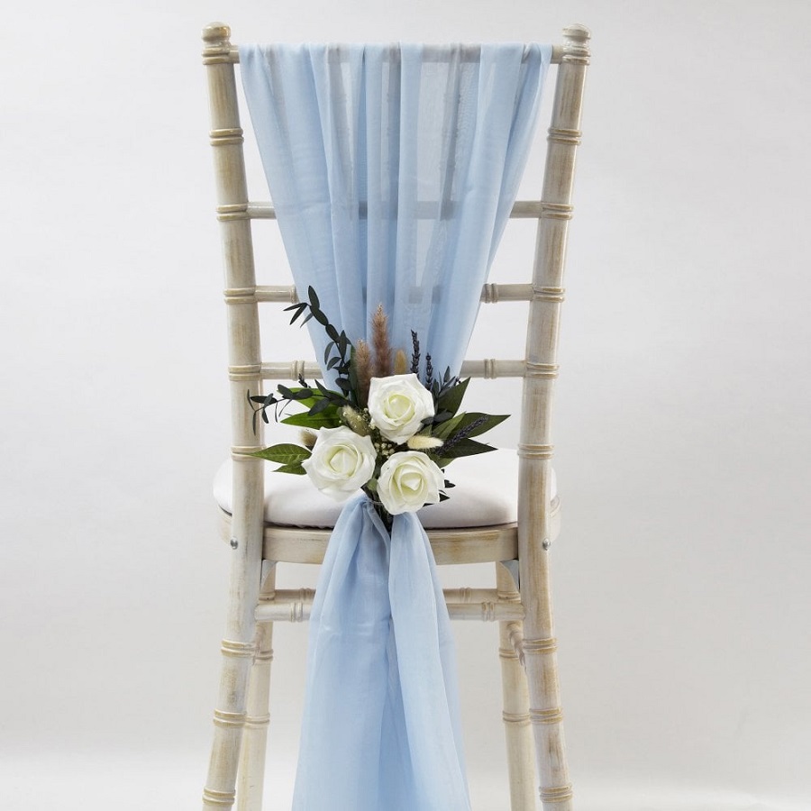 Voan tơ luôn là lựa chọn số 1 của nơ ghế bởi sự linh hoạt trong các kiểu thắt nơ cũng như đa dạng sắc màu. Bạn chẳng cần trang trí cầu kỳ hay thắt nơ rườm rà vì ngay từ chất liệu, nơ ghế đã mang đến vẻ đẹp mềm mại, ngọt ngào